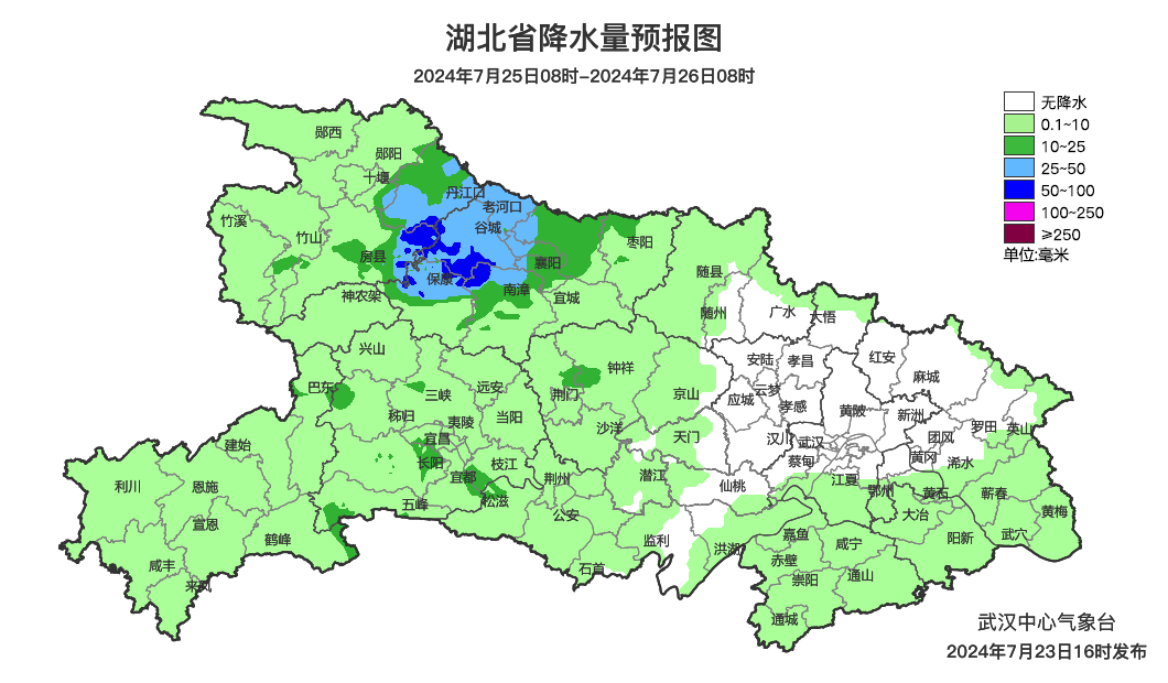 25日08时-26日08时,鄂西北多云转中到大雨,局地暴雨并伴有短时强降水、雷暴大风等强对流天气;其他地区多云有分散性阵雨或雷阵雨。最高气温35~38℃,最低气温25~30℃,偏北风2到3级转3到4级、阵风5到6级。