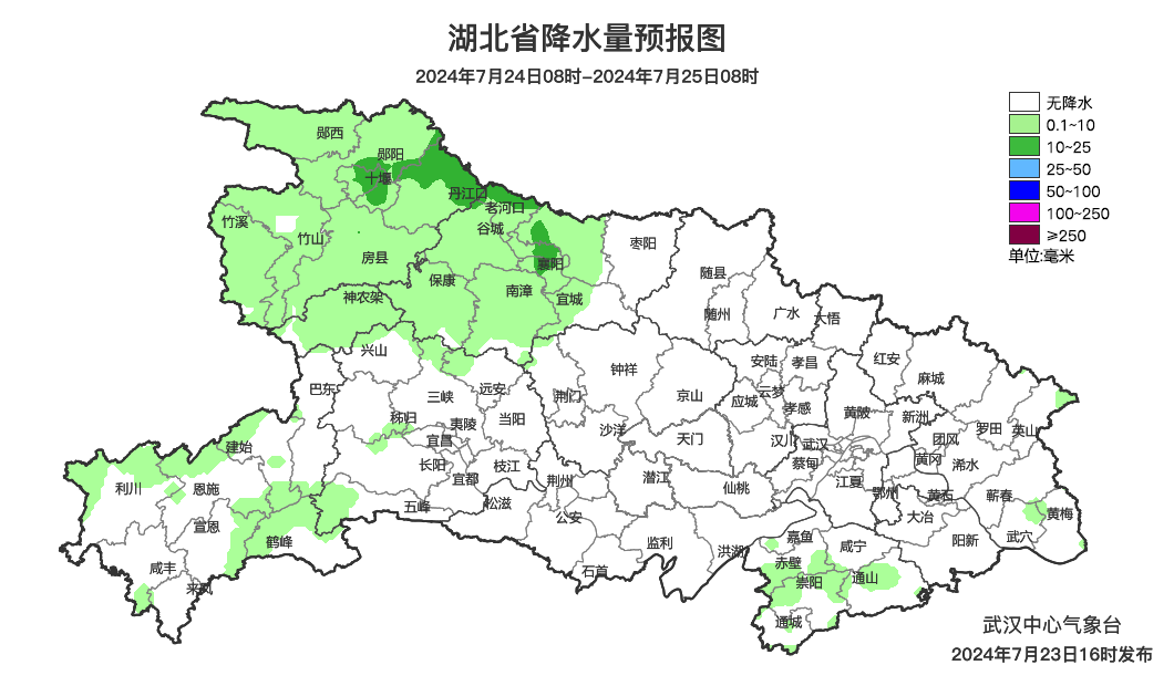 24日08时-25日08时,鄂西北、鄂西南多云有分散性阵雨或雷阵雨;其他地区晴天到多云,其中鄂东北东部、鄂东南局地有阵雨或雷阵雨。最高气温36~39℃、局地40℃以上,最低气温25~30℃,偏东风2到3级。