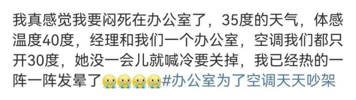 据潇湘晨报7月17日报道,一网友发帖求助办公室里每天都为了空调吵架:一早上从地铁站到公司真的很热,到办公室就开了空调。刚打开就有人开始说了温度开高点。开了个会回办公室,发现空调不知道又被谁关了,今天最高气温37℃啊,热都热死了!我说要把空调调低一点点,一直开的最低速,有人还说冷冷冷。