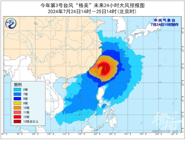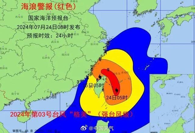 中央气象台7月24日10时发布台风红色预警,今年第3号台风“格美”今天(24日)上午8点钟由强台风级加强为超强台风级,上午9点钟其中心位于我国台湾省宜兰县东南方大约195公里的洋面上,就是北纬23.6度、东经123.2度,中心附近最大风力有16级(55米/秒),中心最低气压为930百帕,七级风圈半径250-380公里,十级风圈半径100-120公里,十二级风圈半径55-65公里。