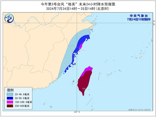 降水预报:7月24日14时至25日14时,浙江东南部、福建东部、台湾岛等地有大到暴雨,其中,浙江东南部、福建东北部、台湾岛等地部分地区有大暴雨,台湾岛东部和南部有特大暴雨(250-600毫米)。