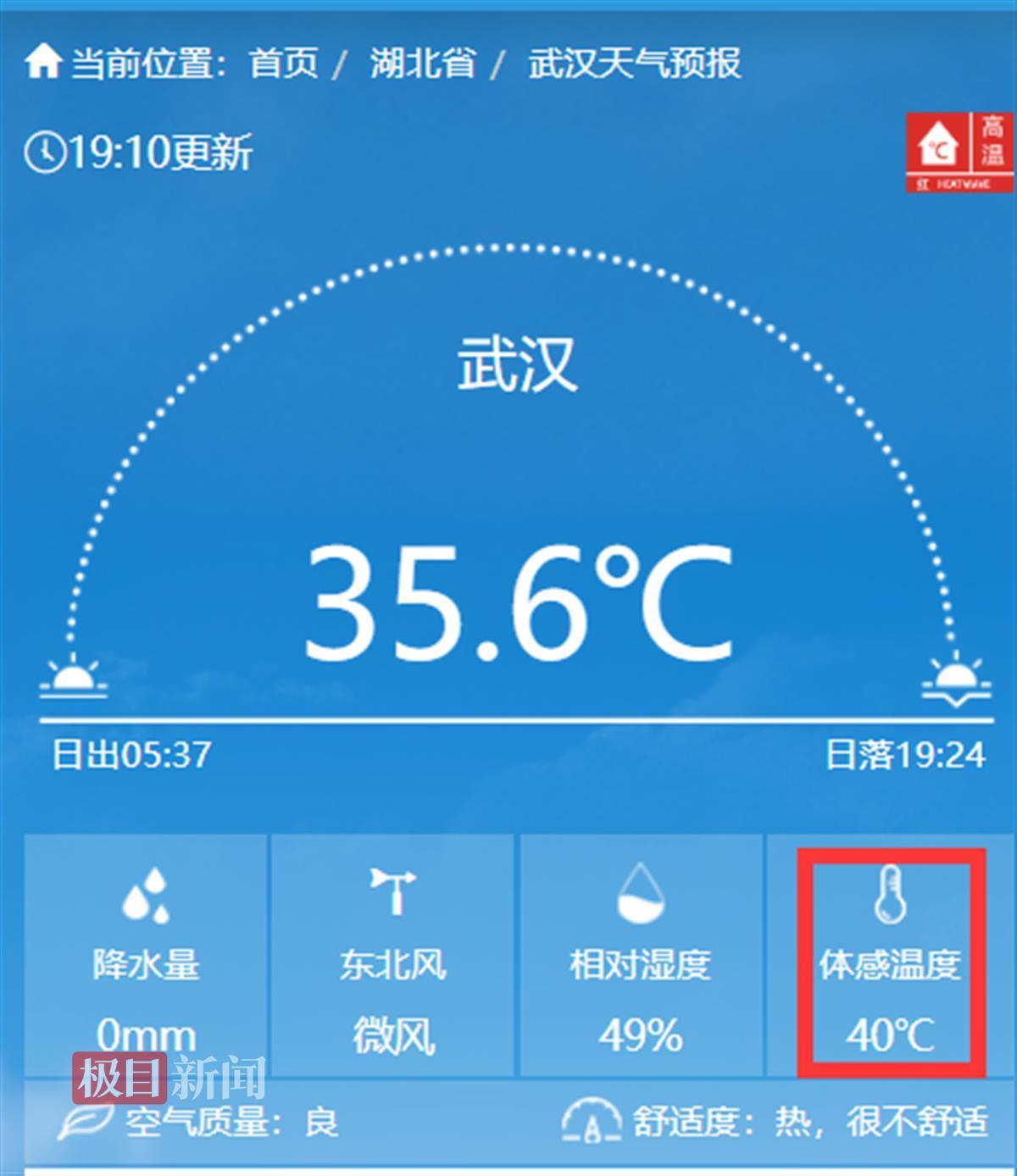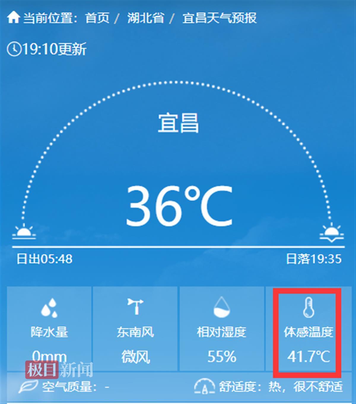 大家可上中央气象台官网查询所在城市的体感温度。比如,同是24日19时,武汉气温35.6℃,体感温度40℃,而宜昌19时气温36℃,体感温度41.7℃。