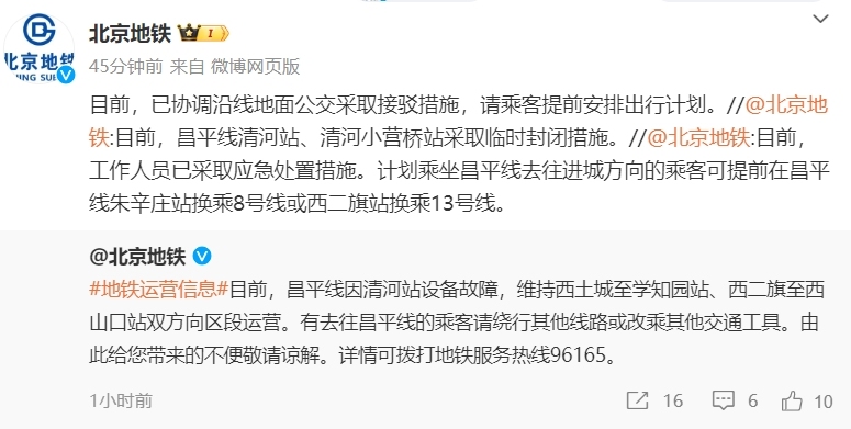 新京报讯据@北京地铁微博消息,昌平线因清河站设备故障,维持西土城至学知园站、西二旗至西山口站双方向区段运营。昌平线清河站、清河小营桥站采取临时封闭措施。