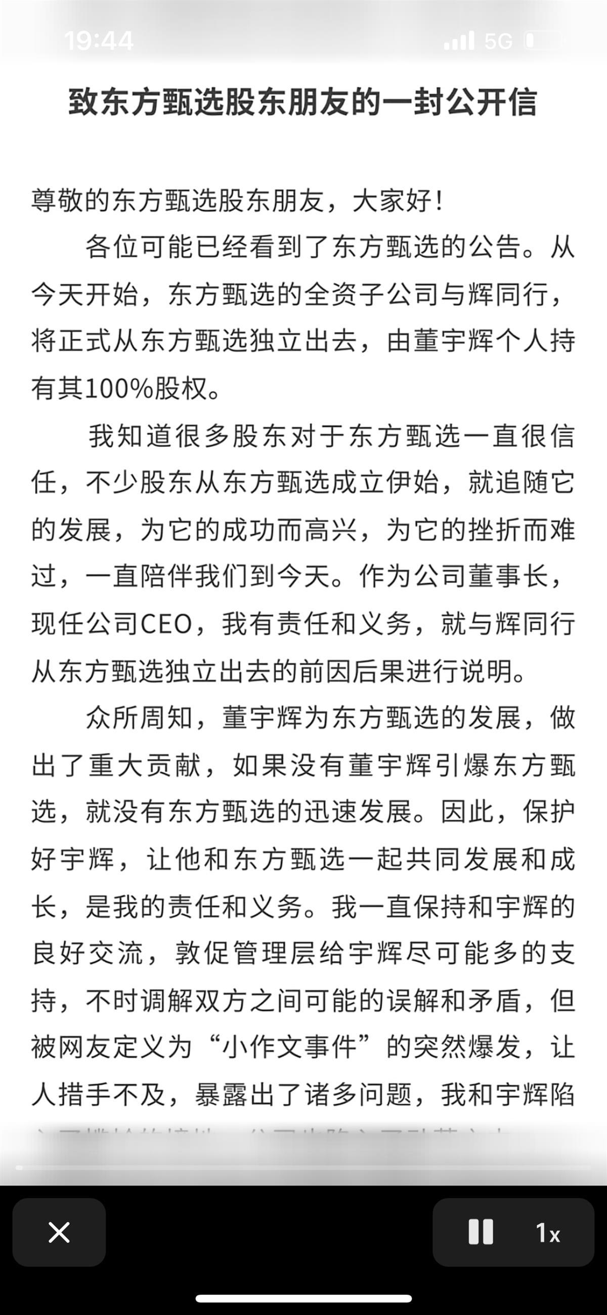 7月25日,东方甄选在港交所发布公告:“经公司与董宇辉友好讨论后,董宇辉决定离任公司雇员以及本公司一间合并联属实体的高级管理层。该离任是出于董宇辉的职业抱负、对彼其他事业的投入及个人时间安排,并于2024年7月25日生效。”