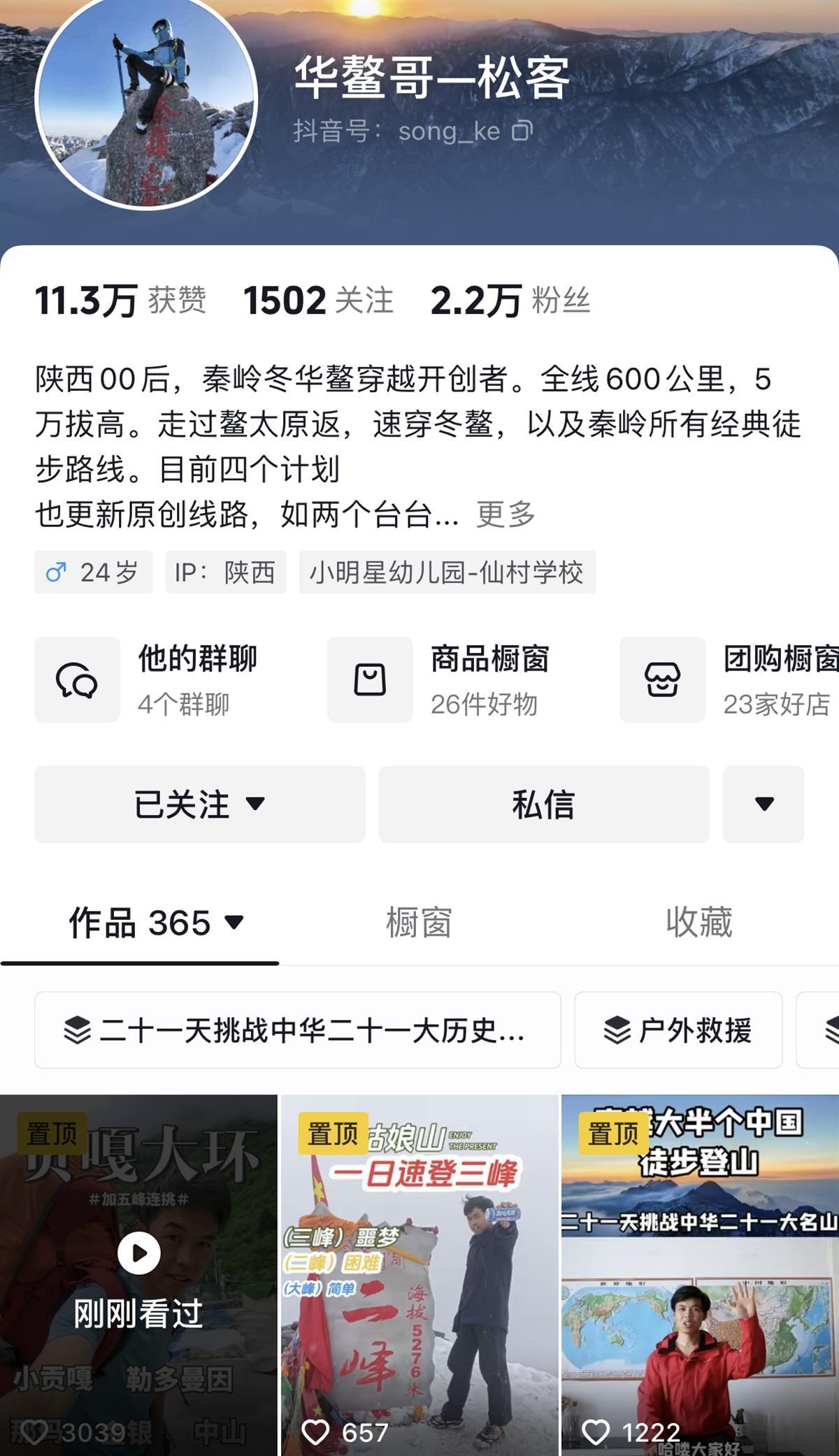 记者在“松客”社交平台看到,其介绍一栏显示为:“陕西00后,秦岭冬华鳌穿越开创者,全线600公里,5万拔高。走过鳌太原返,速穿冬鳌,以及秦岭所有经典徒步路线。”7月10日,该账号发布视频称,他收拾好物资,准备走贡嘎大环线,全线大概360公里,“我挑战一把,看20来天能不能走完。”