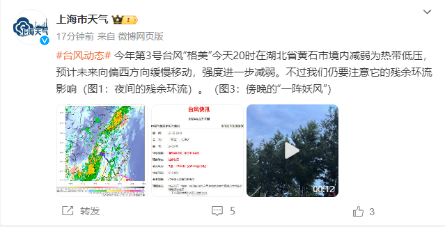 今年第3号台风“格美”在湖北省黄石市境内减弱为热带低压,预计未来向偏西方向缓慢移动,强度进一步减弱。不过我们仍要注意它的残余环流影响。(此前报道:台风“格美”强度逐渐减弱,上海新一轮高温日无缝衔接)