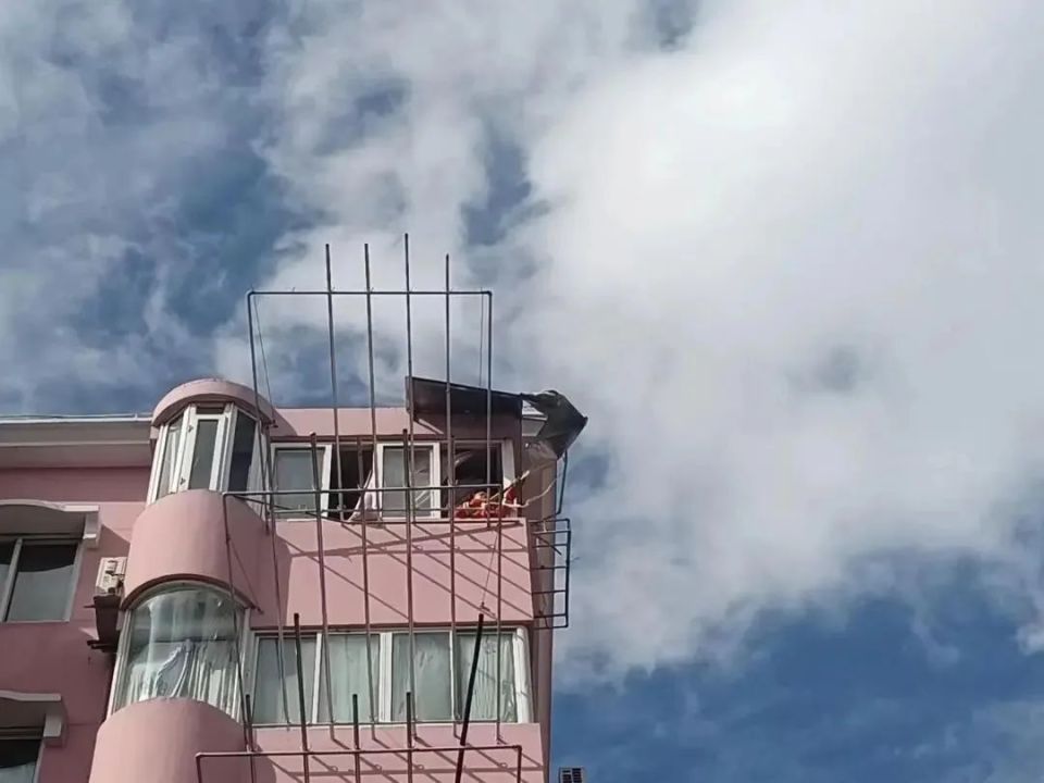 当时风向是东南风,由于涉事雨棚位于小区六楼东南角正面向风口,一半雨棚已经被吹得翻转过来,随时可能掉落。最后,消防人员站在阳台的窗台上,利用消防腰斧,挠钩等破拆工具对不稳定的雨棚进行现场拆除。