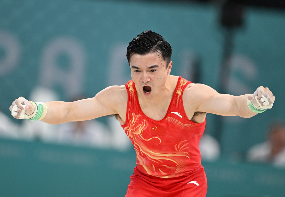 7月29日,中国队选手肖若腾在自由操比赛后庆祝。新华社记者 曹灿 摄