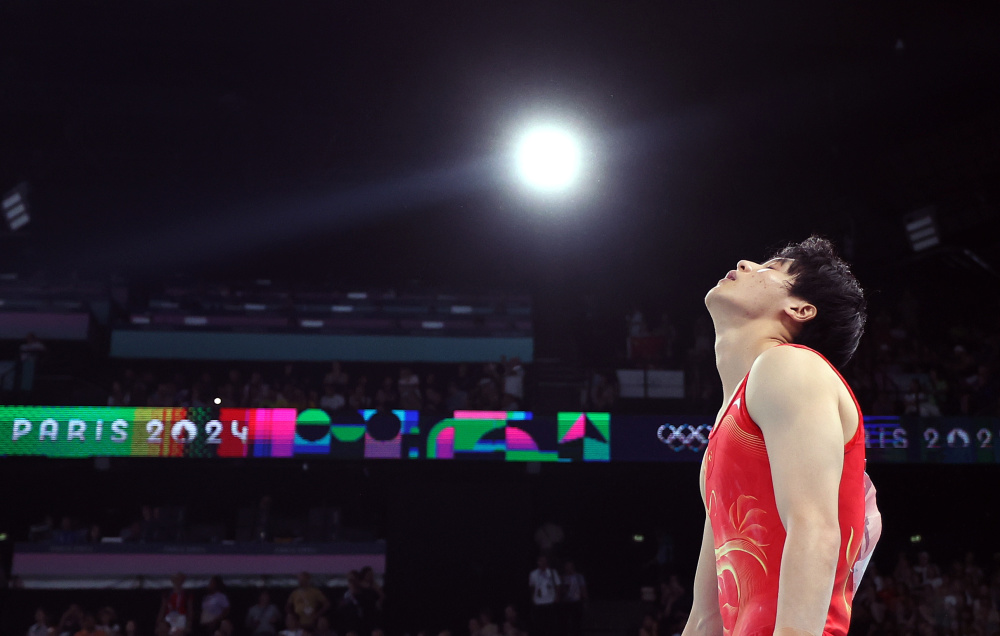 7月29日,中国队选手苏炜德在单杠比赛后。新华社记者 曹灿 摄