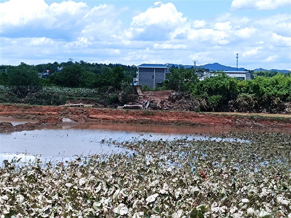 贺师傅说,29日凌晨4时许,涓水的水位开始下降。记者看到,到30日中午,涓水河离着堤顶有三四米的落差,堤内地势也比河面高,村里一处闸口正利用落差排水。堤内外都有农田,大部分种着水稻,还有一些种着湘莲。村民宾师傅种了约90亩湘莲,他介绍,现在正是莲蓬上市的旺季,他有约40亩湘莲田受灾严重加上套养的鱼也跑了,损失较大。