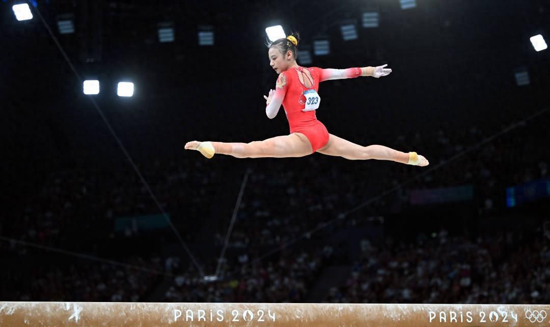 在巴黎奥运会体操女子团体决赛中,由罗欢、欧钰珊 、邱祺缘、张怡涵和周雅琴组成的中国队出战。