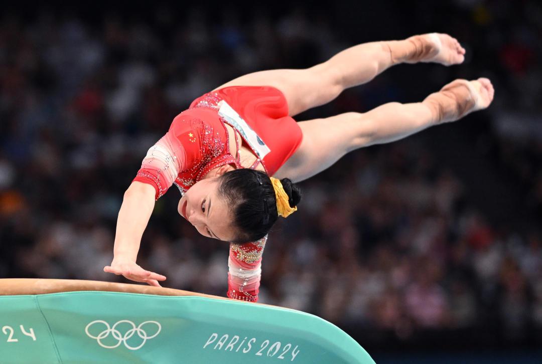 中国队选手张怡涵在跳马比赛中。新华社记者 程敏 摄