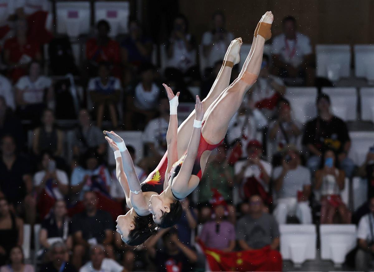 7月31日,中国选手陈芋汐(后)/全红婵在比赛中(来源:新华社记者李颖摄)
