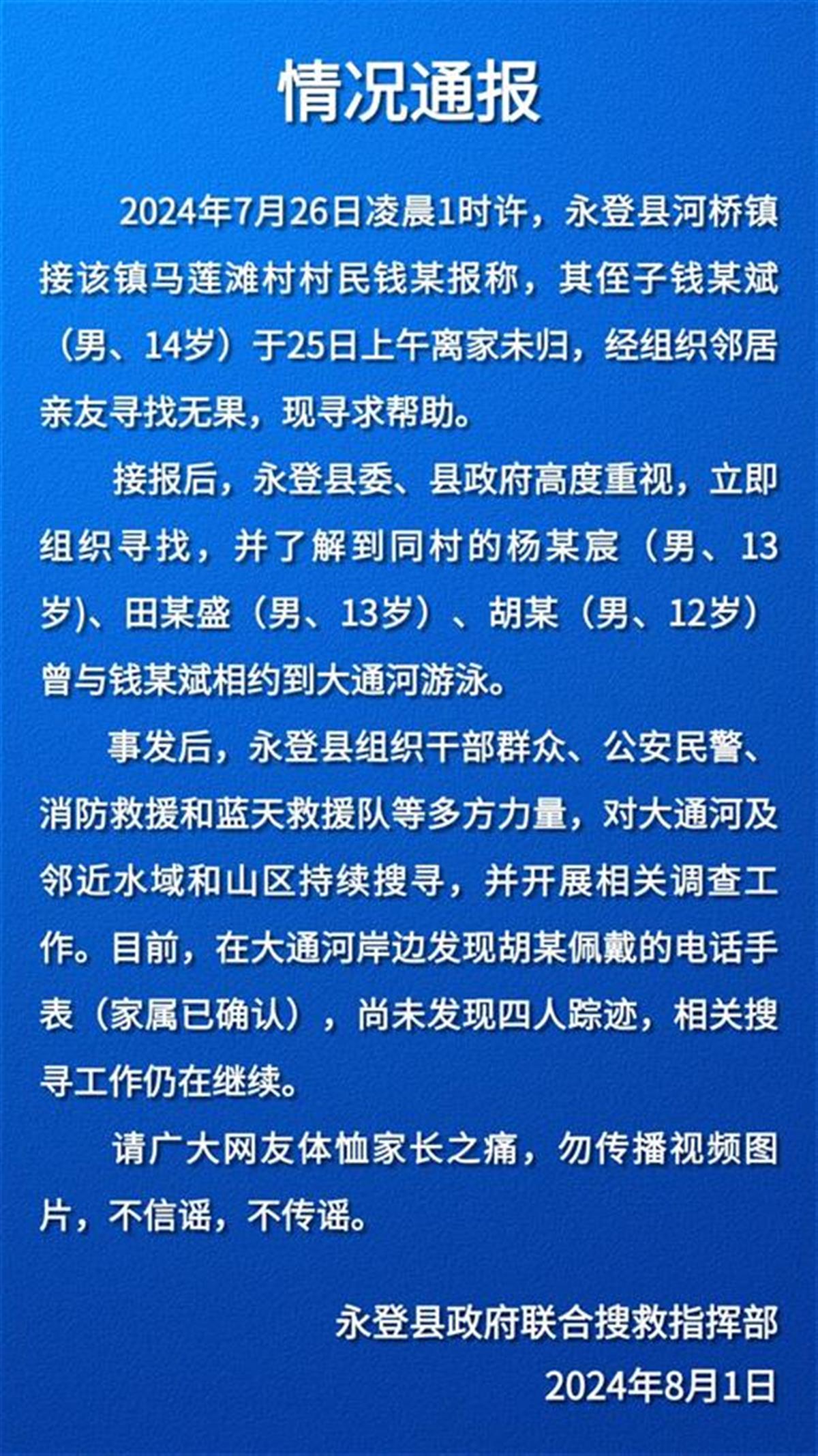事发后,永登县组织干部群众、公安民警、消防救援队和蓝天救援队等多方力量,对大通河及邻近水域和山区持续搜寻,并开展相关调查工作。目前,在大通河岸边发现胡某佩戴的电话手表(家属已确认),尚未发现四人踪迹,相关搜寻工作仍在继续。