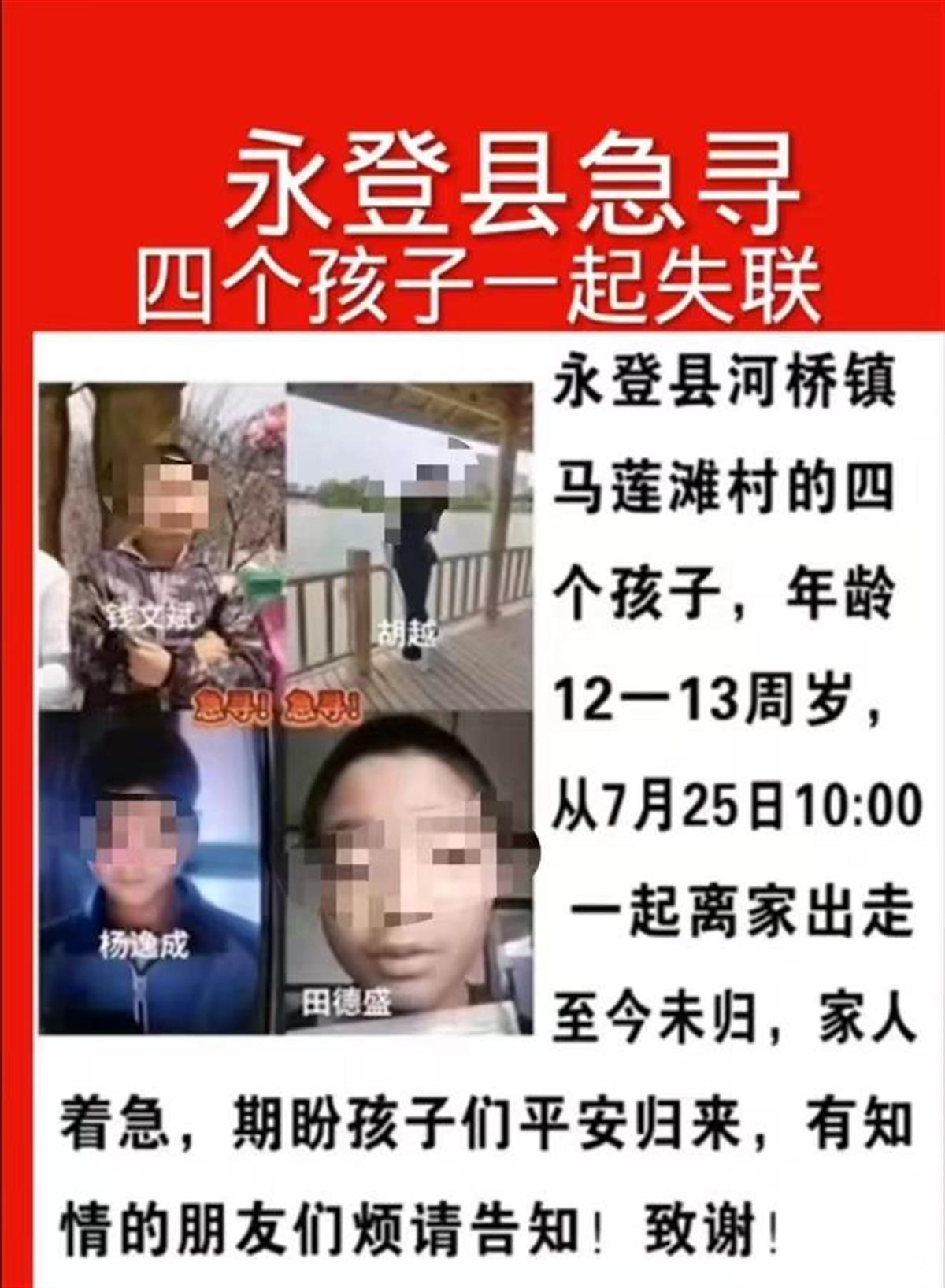 据极目新闻此前报道,近日,有多位网友发文称,甘肃省兰州市永登县有四名孩子失踪。家属胡先生向极目新闻记者介绍,7月25日,他家孩子同村子里三个玩伴离奇失踪。四个男孩都在十二三岁,分属村里不同家庭,其中三个孩子今年六年级毕业,另一个已读初一,他们打篮球时认识并一起玩耍。