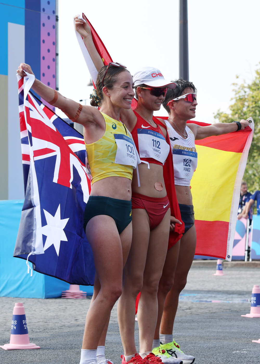 8月1日,冠军中国选手杨家玉(中)、亚军西班牙选手佩雷斯(右)、季军澳大利亚选手蒙塔格在赛后合影。新华社记者 李颖 摄