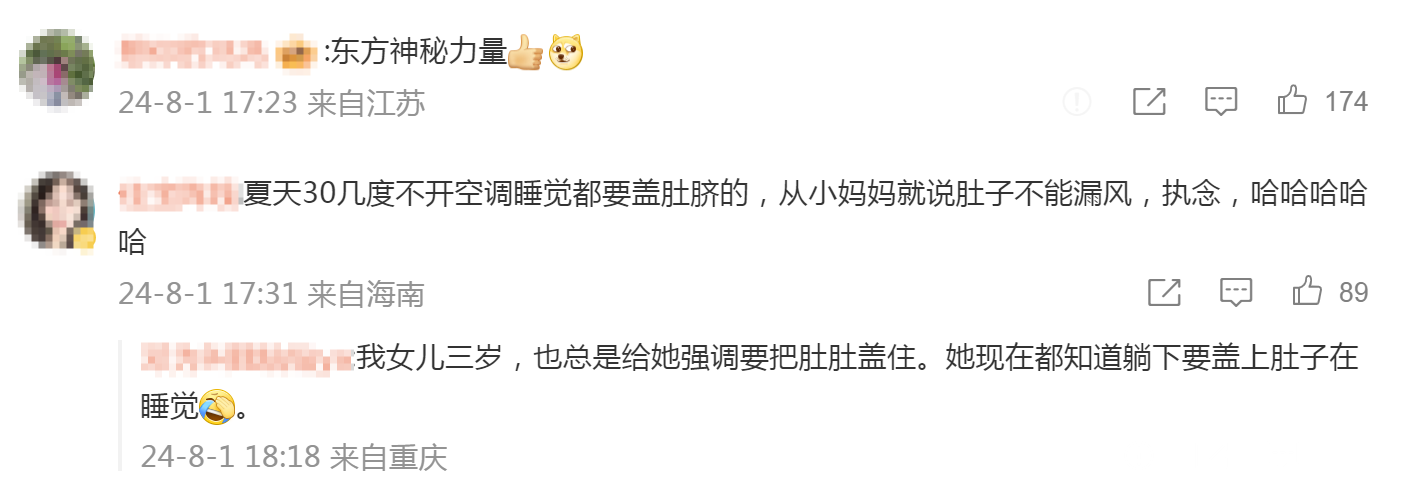 许多网友也发表评论,“一眼鉴国籍”“任何时候都要盖住肚脐”“不盖会窜稀”。