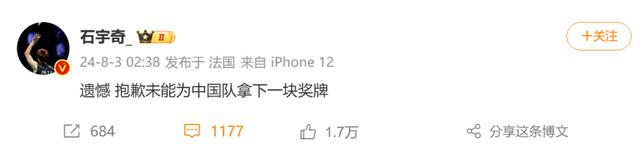 刚刚,石宇奇在社交平台发文称:遗憾,抱歉,未能为中国队拿下一块奖牌。