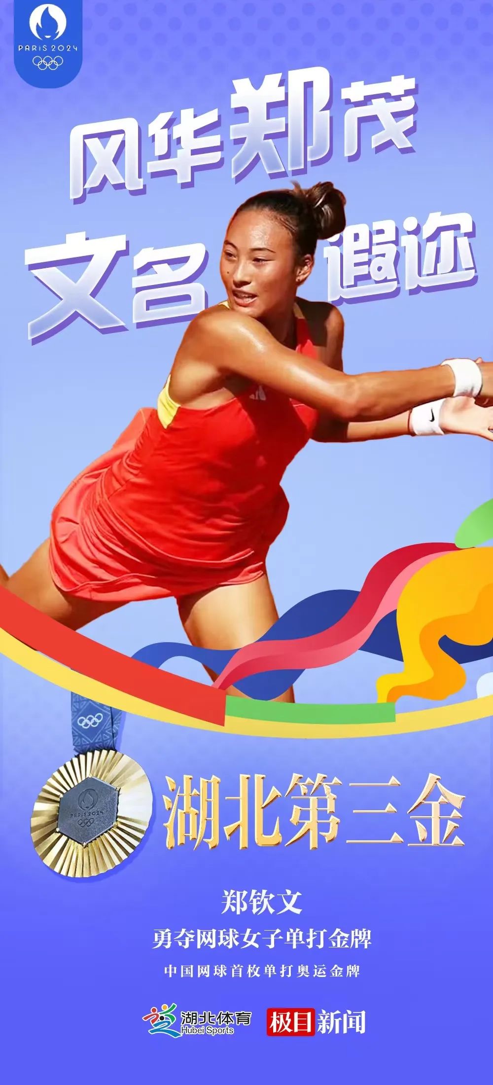 欣悉我省运动员郑钦文在巴黎奥运会网球比赛中,顽强奋战、连克强手,夺得女子单打金牌,成为获得奥运会网球单打冠军的亚洲第一人,开创了中国网球运动历史,为祖国赢得了荣誉,为湖北增添了光彩,全省人民欢欣鼓舞、倍感自豪!在此谨向中国体育代表团、中国网球队和郑钦文致以热烈祝贺!向国家体育总局对湖北体育事业的关心支持表示衷心感谢!