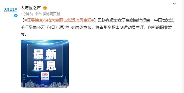 巴黎奥运会女子重剑金牌得主,中国香港选手江旻憓今天(4日)通过社交媒体宣布,将告别全职击剑运动员生涯,向新的职业发展。