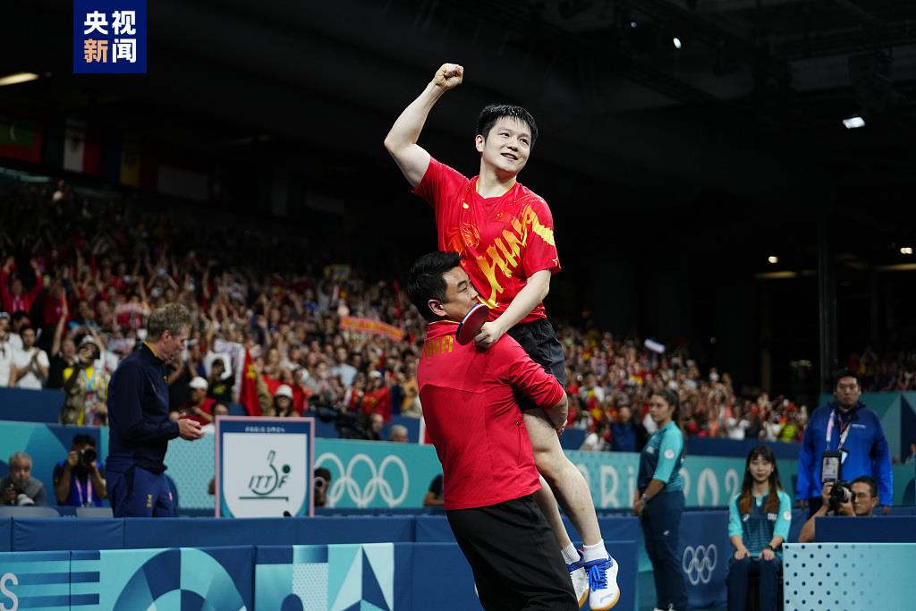 赛后,教练王皓将樊振东高高举起,师徒二人一起享受夺金后的喜悦!