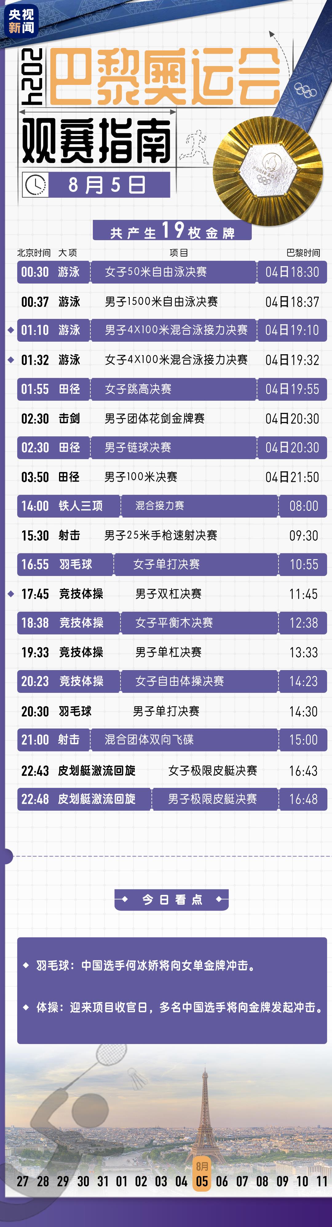 巴黎奥运会第十个比赛日将产生20枚金牌(其中2枚时间待定)。羽毛球、体操、射击迎来收官之战,场地自行车迎来巴黎奥运会首秀,中国体育代表团将向最高领奖台发起冲击。