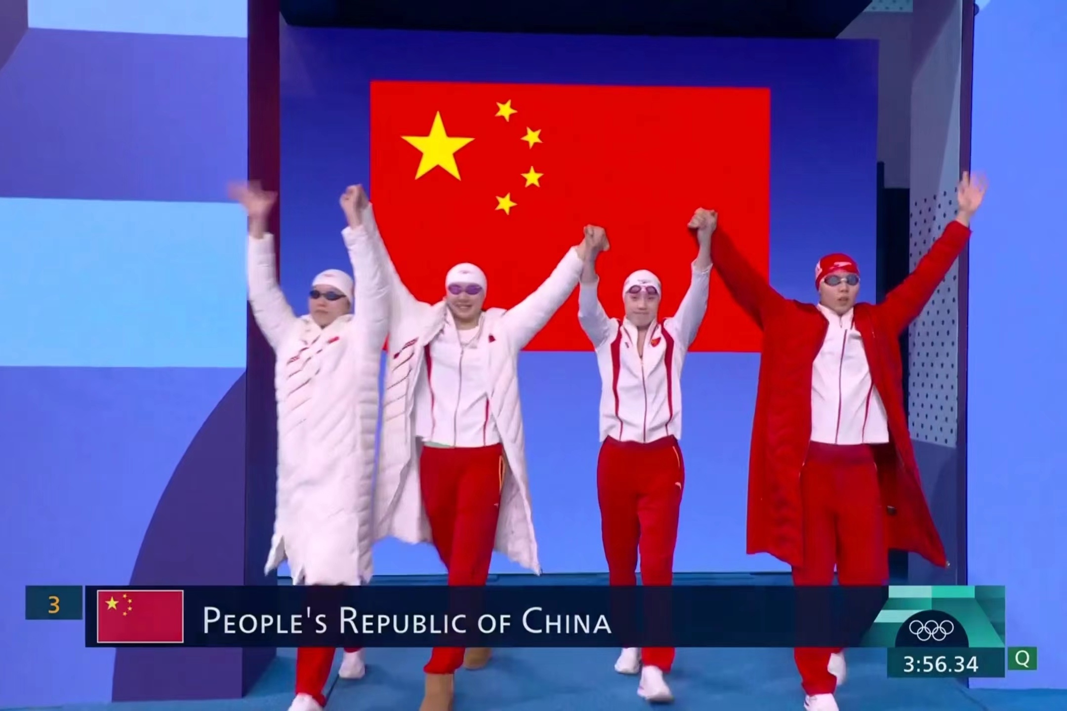 由万乐天、唐钱婷、张雨霏、杨浚瑄组成的中国队夺得女子4X100米混合泳接力铜牌,为中国游泳队本届奥运会征程画上圆满句号。