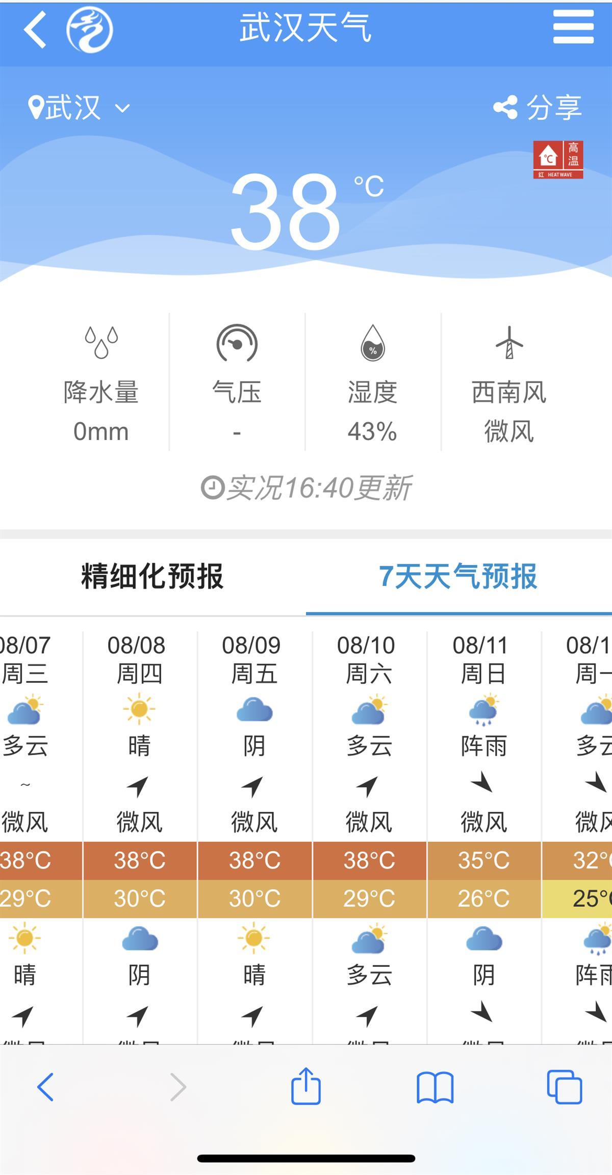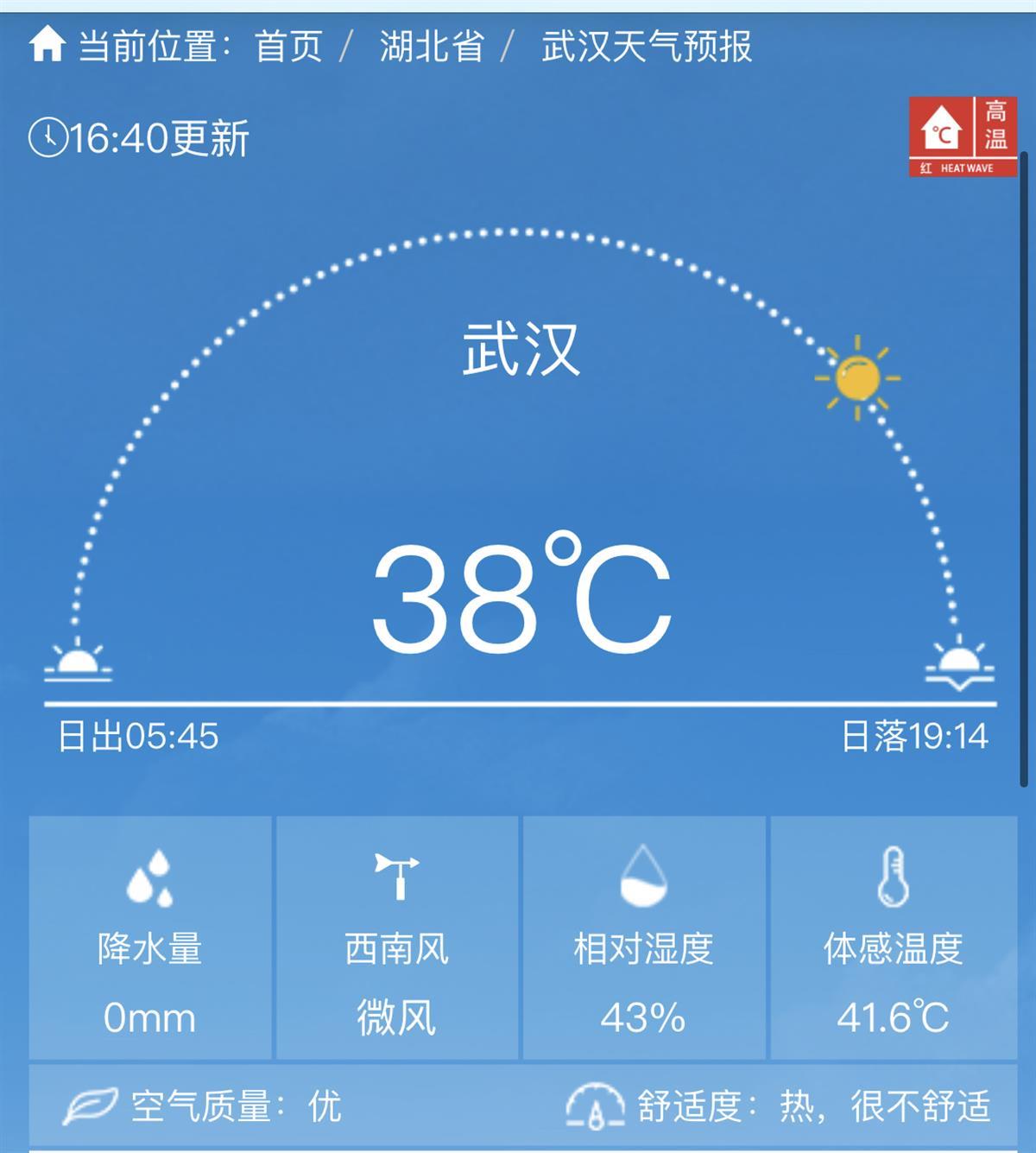 气象监测显示,6日16时40分,武汉国家级气象站测定的气温为38℃,但体感温度高达41.6℃。所以,明天气温超40℃,体感温度会更高。大家在10时至15时尽可能减少户外活动。