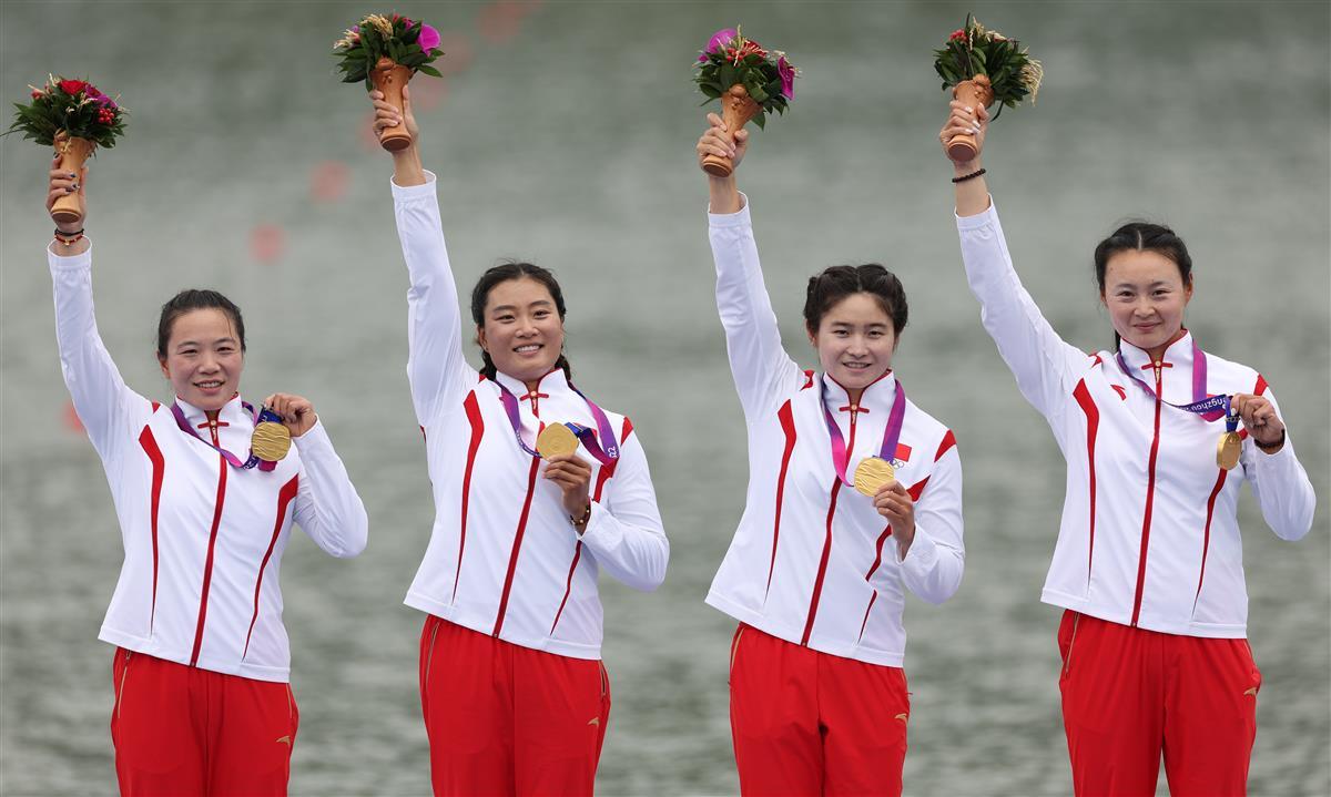 孙悦雯(右一)与队友获杭州亚运会女子500米四人皮艇金牌(新华社资料图)