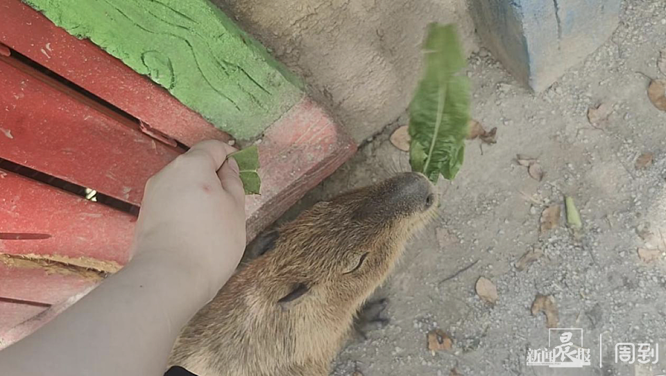 记者和同事共花费60元进入水豚互动体验区,工作人员提醒记者虽然可以触摸,但不要触摸水豚嘴部,并递给记者三根菜叶,表示:“大菜叶给一根,小菜叶给两根。”和“袋鼠坡”一样,水豚互动体验区内也有一名巡场的工作人员时刻注意游客和水豚的互动情况,不断提醒游客不要大声喧哗、不要奔跑、动作放慢。记者投喂水豚时,水豚动作均缓慢轻柔。