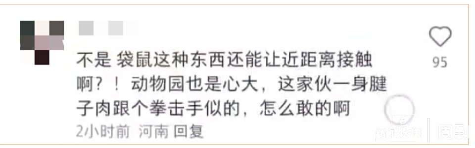 对于与袋鼠互动,很多网友也表达了担忧,有网友表示不解:“袋鼠这种东西还能让近距离接触啊?动物园也是心大,这家伙一身腱子肉跟个拳击手似的,怎么敢的啊?”