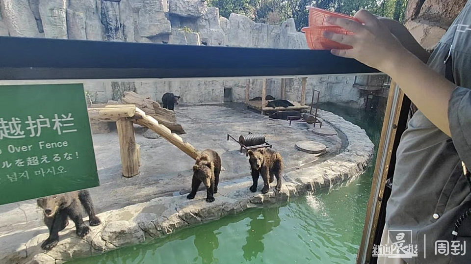 而在棕熊水世界的“棕熊互动体验区”,游客在交费、领取投喂食物后,是在二楼位置向一楼位置的棕熊扔苹果,二楼位置有玻璃护栏进行保护,并处处贴有“儿童请勿抱起”“请勿敲打玻璃”的提示。