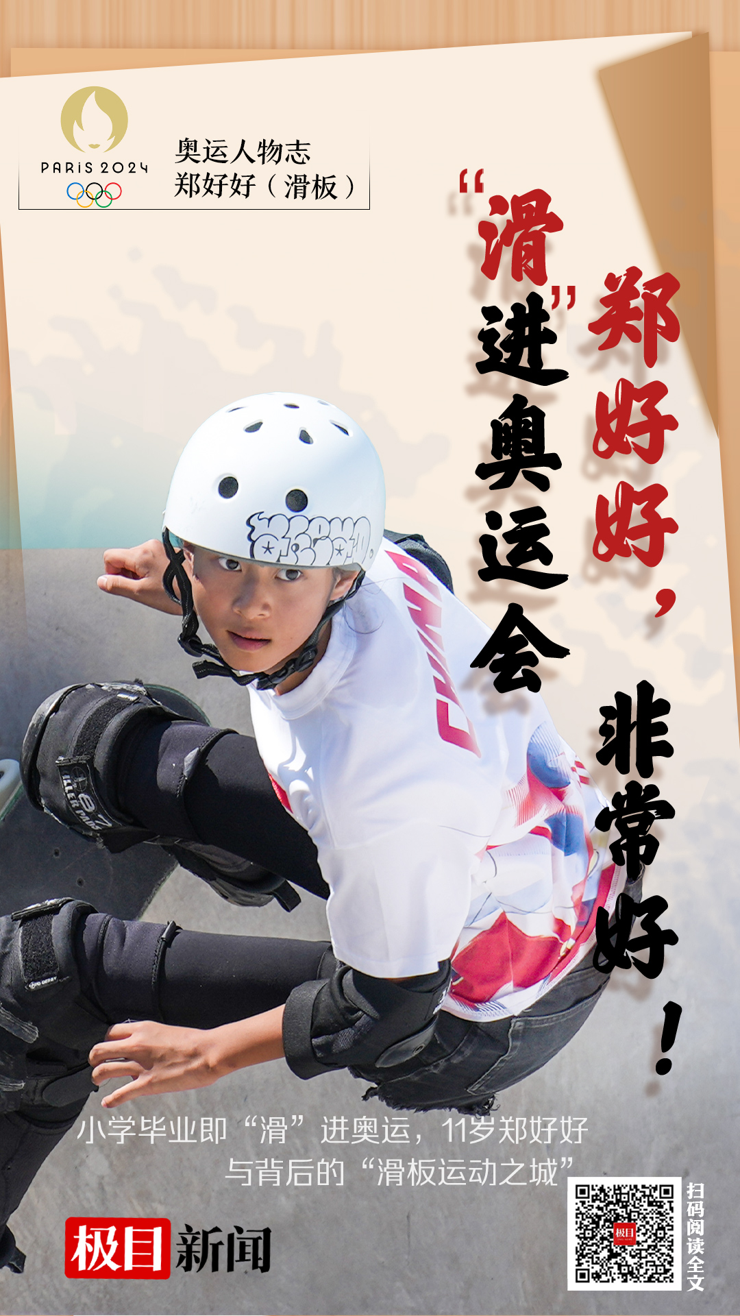 在小学正式毕业的二十多天前,11岁的郑好好在巴黎奥运资格赛女子碗池比赛中,“压哨”获得巴黎奥运会门票。