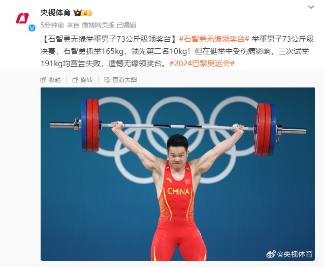 北京时间8月9日,在巴黎奥运会举重男子73公斤级决赛,第三次出战奥运会的老将石智勇抓举165kg,领先第二名10kg!但在挺举中受伤病影响,三次试举191kg均宣告失败,遗憾无缘领奖台。