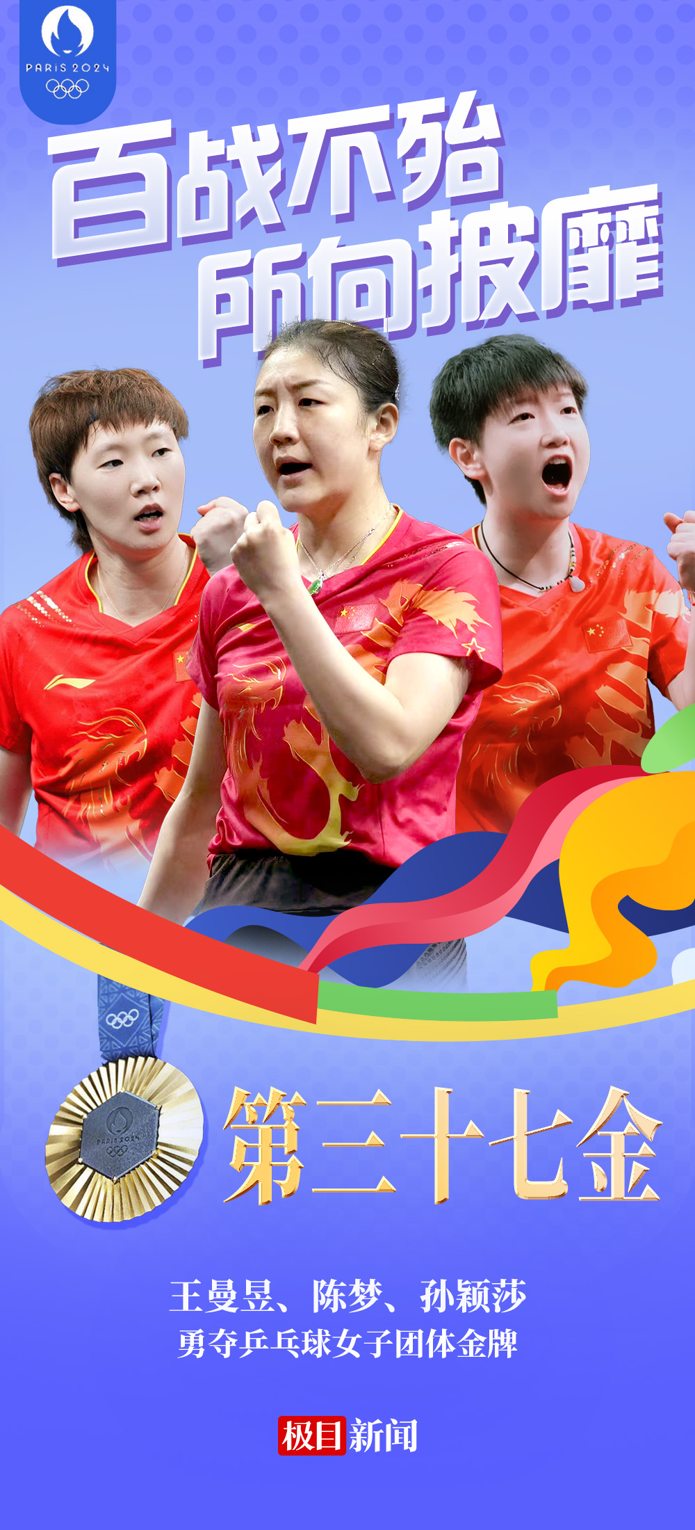 8月10日,在巴黎奥运会乒乓球女子团体决赛中,由陈梦、孙颖莎、王曼昱组成的中国队战胜日本队,夺得金牌,实现奥运五连冠!