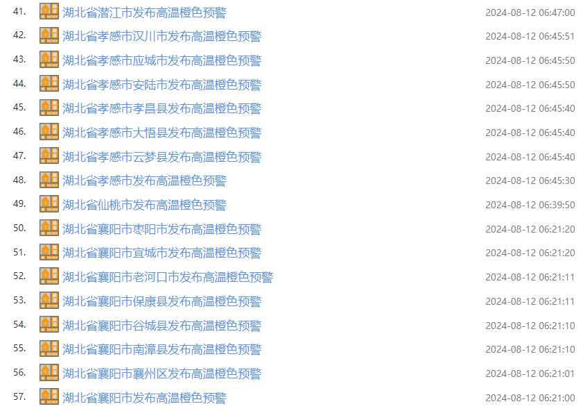8月12日上午,湖北连发57条高温预警,局地可达41℃以上,请注意防范!