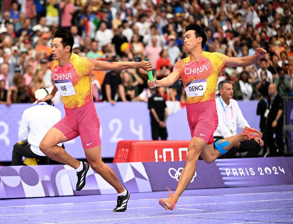 中国队选手谢震业(左)和队友邓智舰在比赛中交接棒。新华社记者 宋彦桦 摄