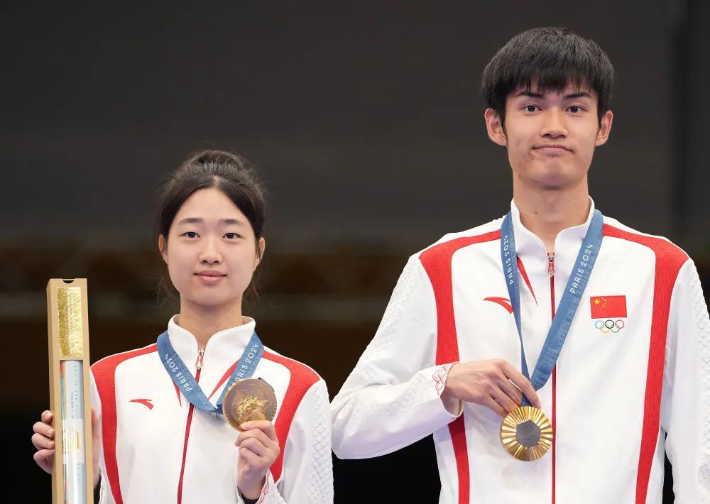 冠军中国选手黄雨婷(左)/盛李豪在颁奖仪式上。新华社记者 鞠焕宗 摄