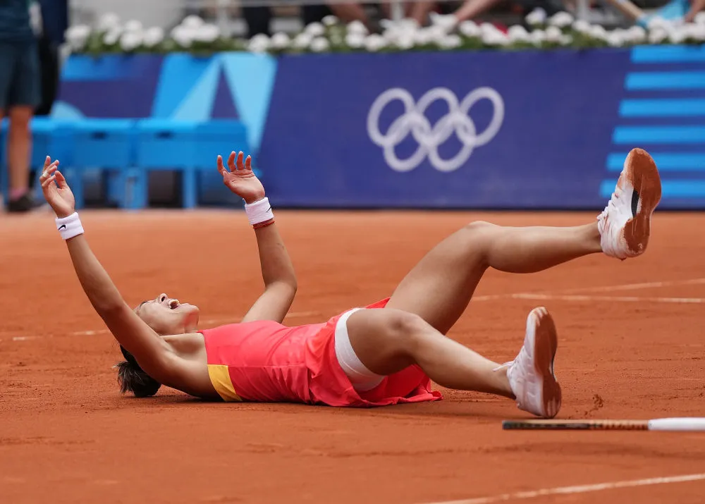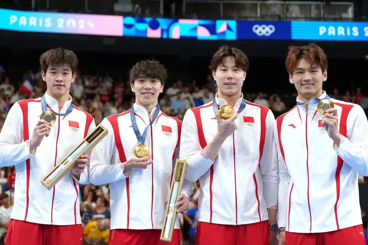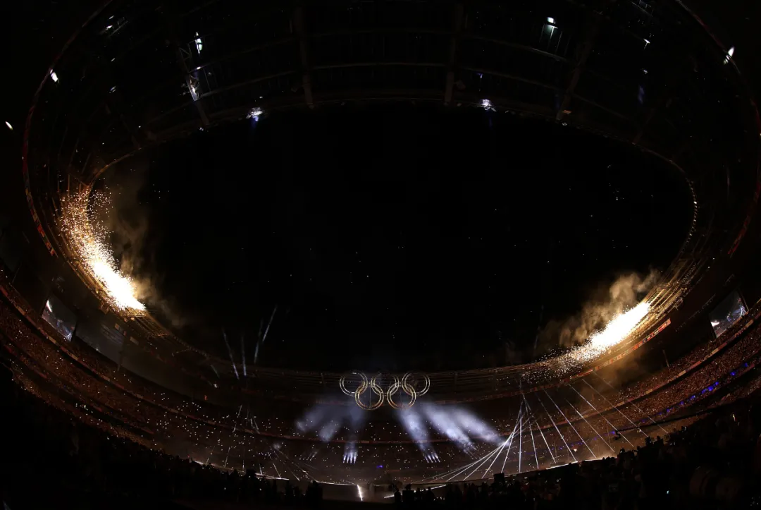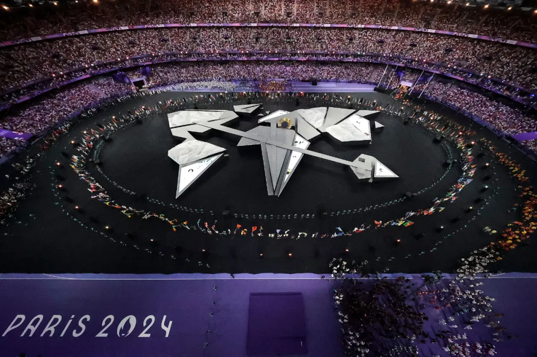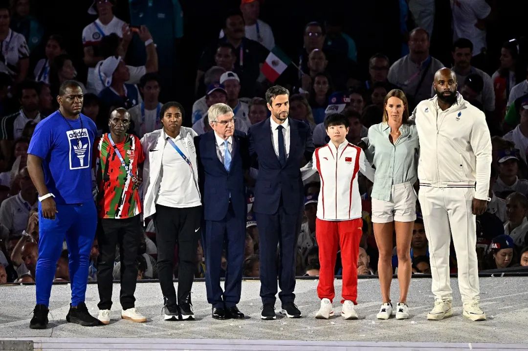 国际奥委会主席巴赫(左四)和巴黎奥组委主席托尼·埃斯坦盖(右四)与运动员代表一起在闭幕式上。新华社记者 王鹏 摄