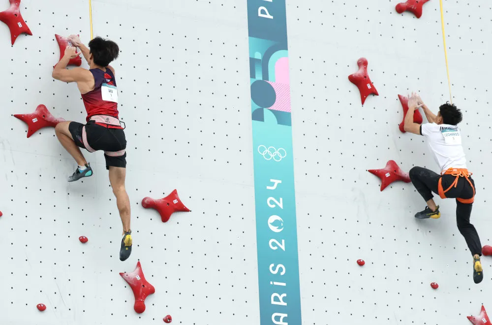 8月8日,中国选手伍鹏在巴黎奥运会男子速度攀岩决赛开始前。新华社记者 高静 摄