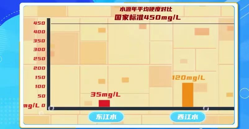2024年6月,西江引水工程(珠三角水资源配置工程)正式通水,改变了深圳只能从东江引水的单一供水格局,深圳成为了双水源城市。西江与东江原水经自来水厂处理后,水质均达到国家标准和深圳地方标准,但东、西江水水质有差异,西江水硬度指标约为120mg/L,高于东江水的35mg/L,但在国家饮用水标准450mg/L的规定范围内,符合国家饮用水标准。硬度表征钙、镁离子的含量表现在用水体验上,西江水在烧水过程中更容易看到水垢。