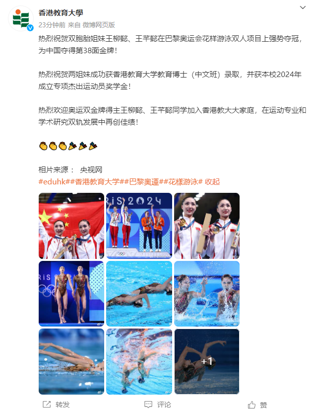 @香港教育大学 官方发文祝贺王柳懿、王芊懿夺冠。