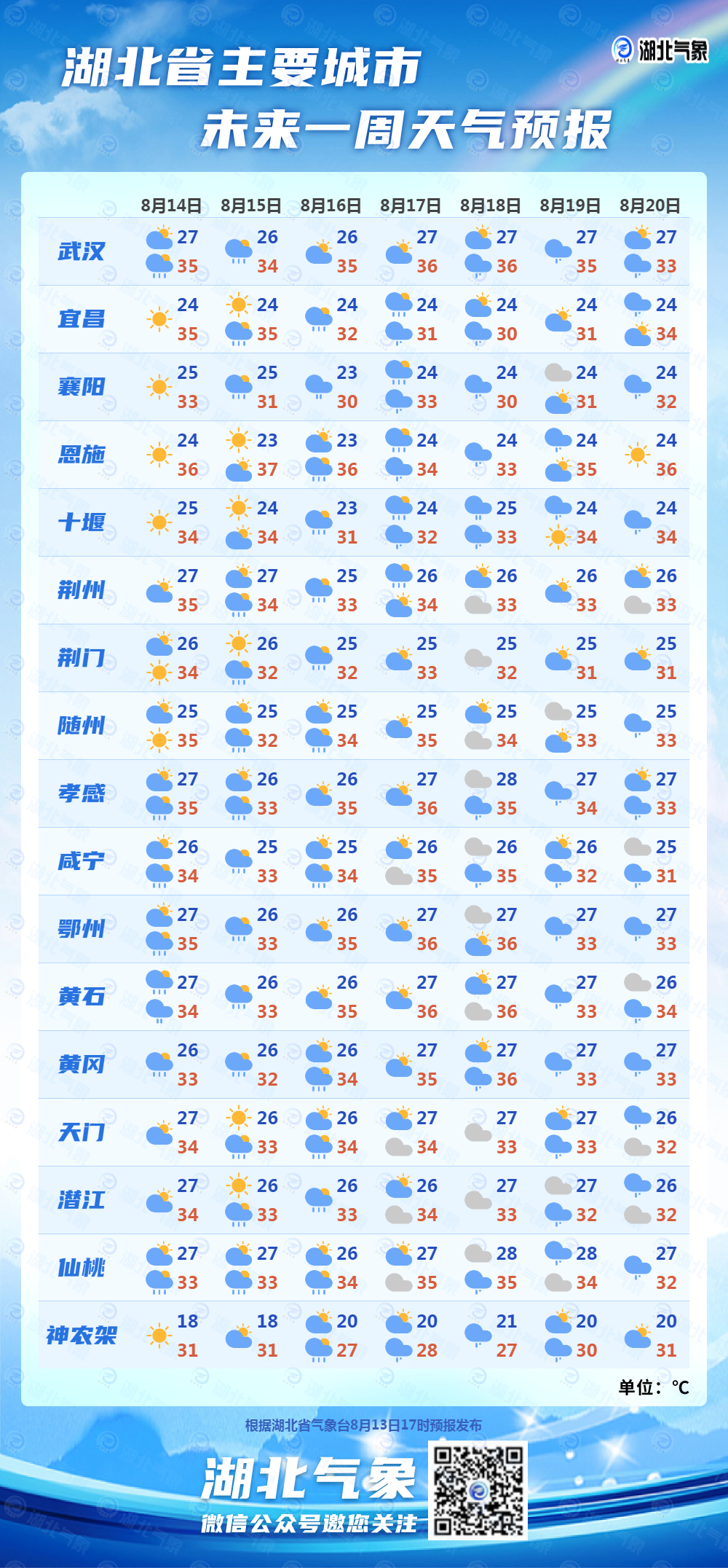 目前,湖北省气象台高温黄色预警持续生效中:预计8月14日白天,十堰西部、宜昌、荆门、随州、孝感、武汉、黄冈北部最高气温将超过35℃,其中宜昌局地可达37℃以上,请注意防范。