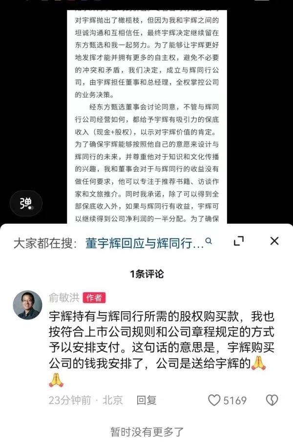 另外,值得注意的是,7月25日,俞敏洪在抖音评论区强调,“宇辉持有与辉同行所需的股权购买款,我也按符合上市公司规则和公司章程规定的方式予以安排支付。这句话的意思是,宇辉购买公司的钱我安排了,公司是送给宇辉的。”