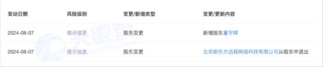 天眼查App显示,近日,与辉同行(北京)科技有限公司发生工商变更,原全资股东北京新东方迅程网络科技有限公司退出,新增董宇辉为股东并全资持股,同时俞敏洪卸任该公司监事。
