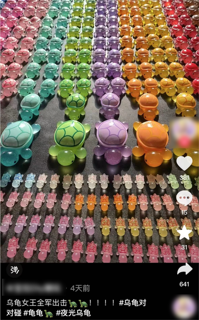 不少玩“乌龟对对碰”的网友都有自己的“乌龟大军”。社交平台上,有网友晒出不同颜色的树脂乌龟“祖孙四代”;还有网友家中乌龟已摆满一地,并表示还有100多个在路上。