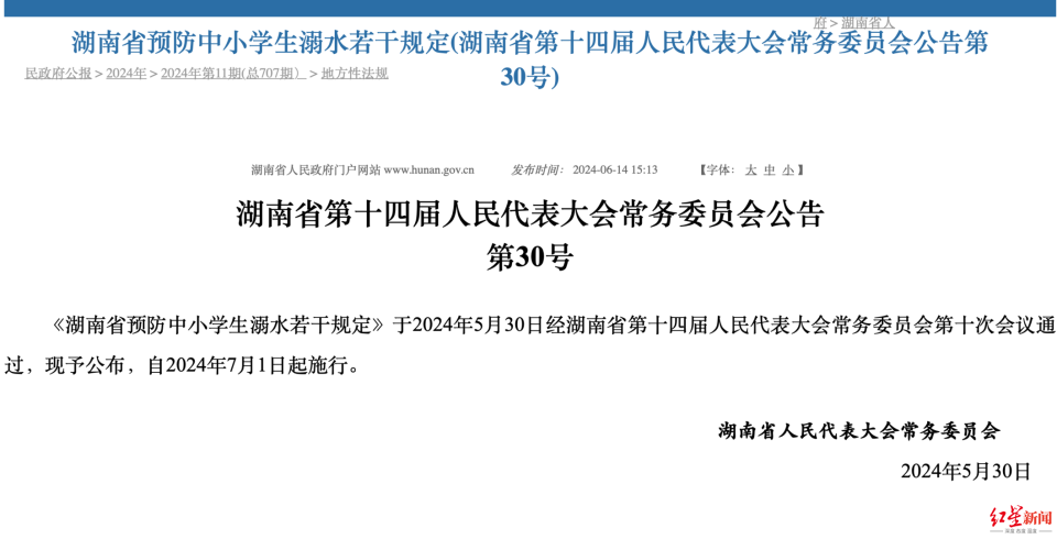 值得一提的是,湖南省人民代表大会常务委员会下发的《湖南省预防中小学生溺水若干规定》(下称《规定》),已从今年7月1日起正式开始实施,这也成为我国第一部专门针对中小学生预防溺水问题出台的地方性法规。