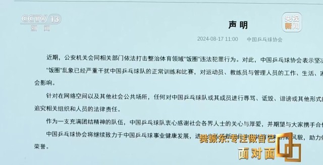 在一些体育项目和优秀运动员受到关注和追捧的大环境中,出现的非理性追星行为被称为饭圈文化。从社交媒体上粉丝之间的互撕谩骂、到线下追星时的围追堵截、恶意攻击,部分极端且失控的“饭圈”行为,很难不对运动员的比赛、训练乃至日常生活造成影响,8月17日,中国乒协发布声明,强烈谴责了饭圈乱象。