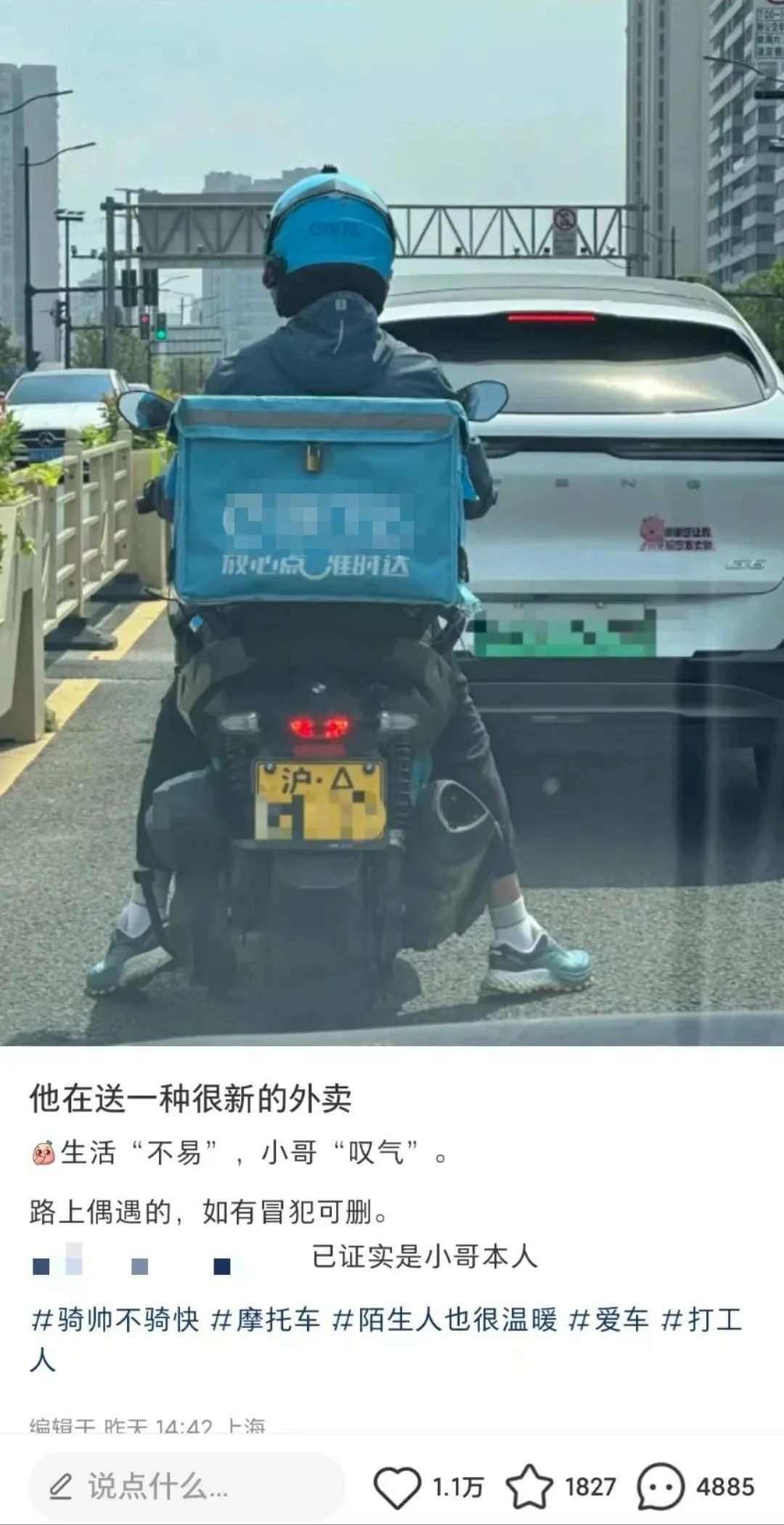 “他在送一种很新的外卖。”近日,一位上海市民将路上偶遇到的外卖小哥骑着“沪A”牌照摩托车的照片分享到社交平台,由于车辆外观上和普通送外卖的摩托车看上去并无明显差异,网传牌照价值50万元,迅速引发网友们的热议。