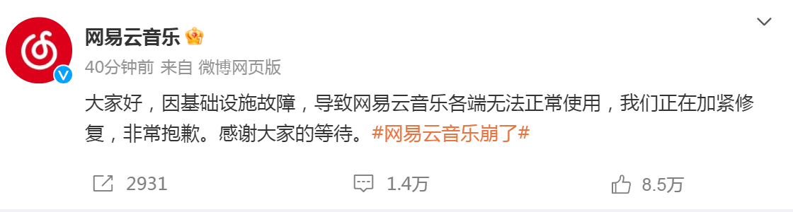 大家好,因基础设施故障,导致网易云音乐各端无法正常使用,我们正在加紧修复,非常抱歉。感谢大家的等待。#网易云音乐崩了#